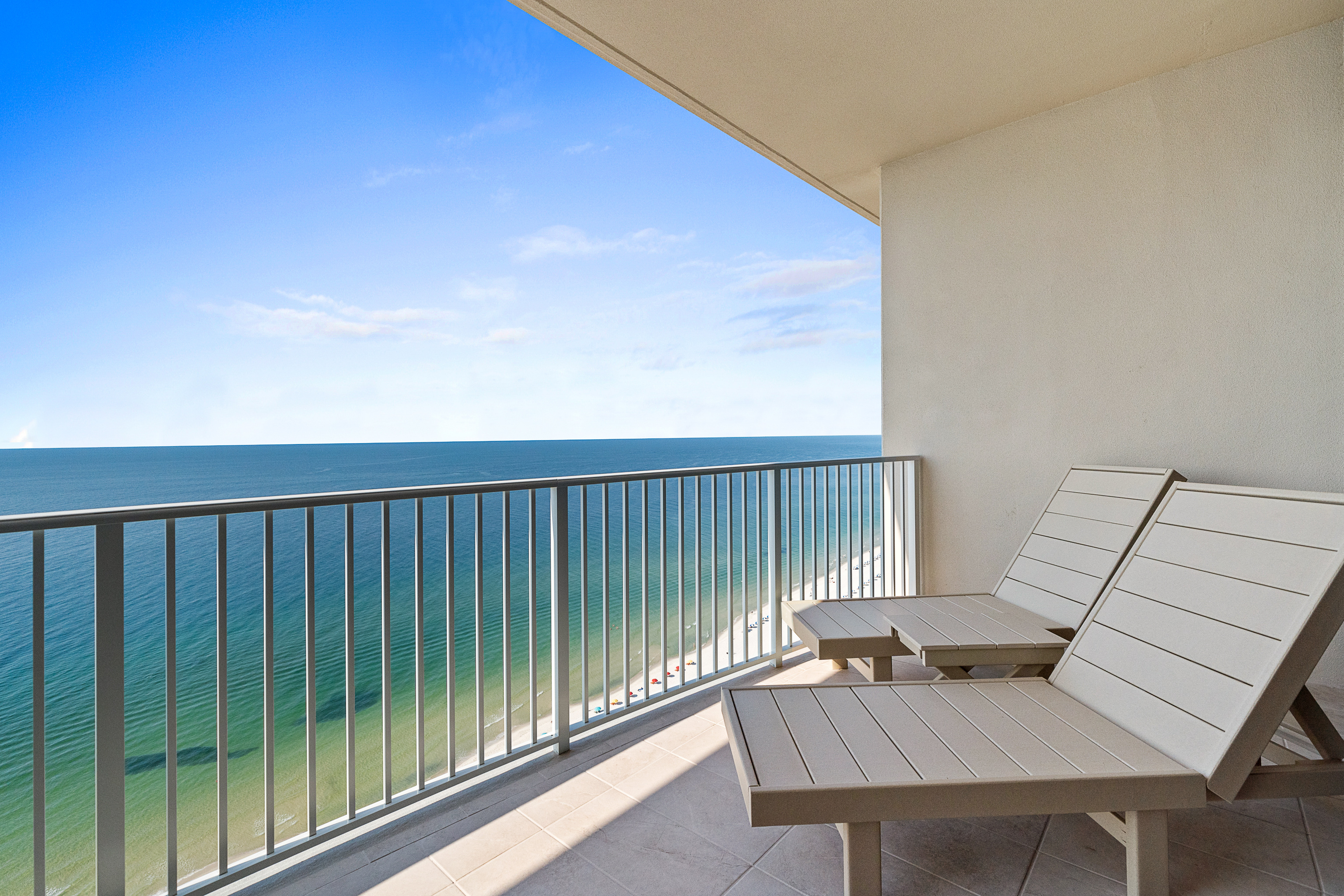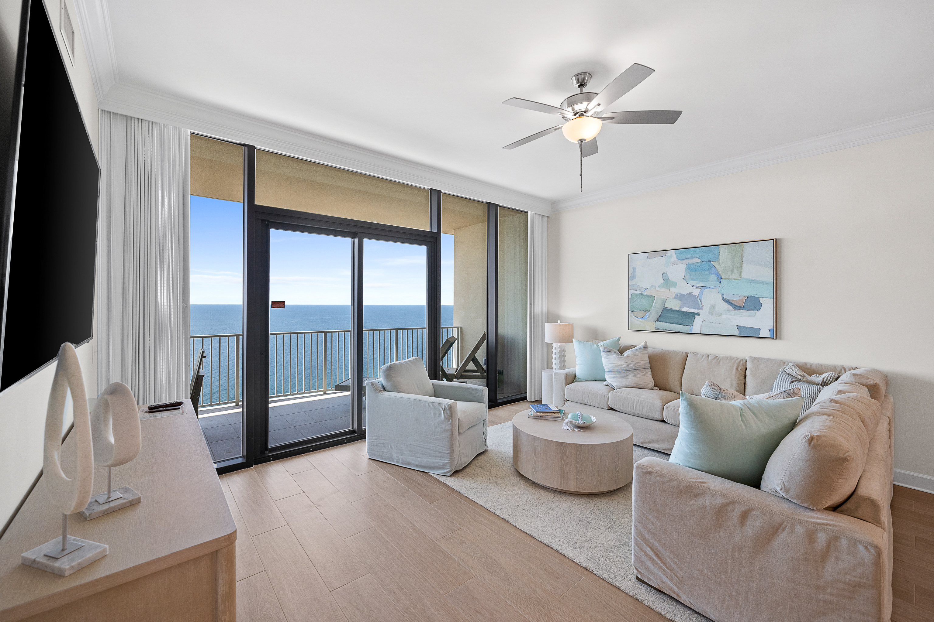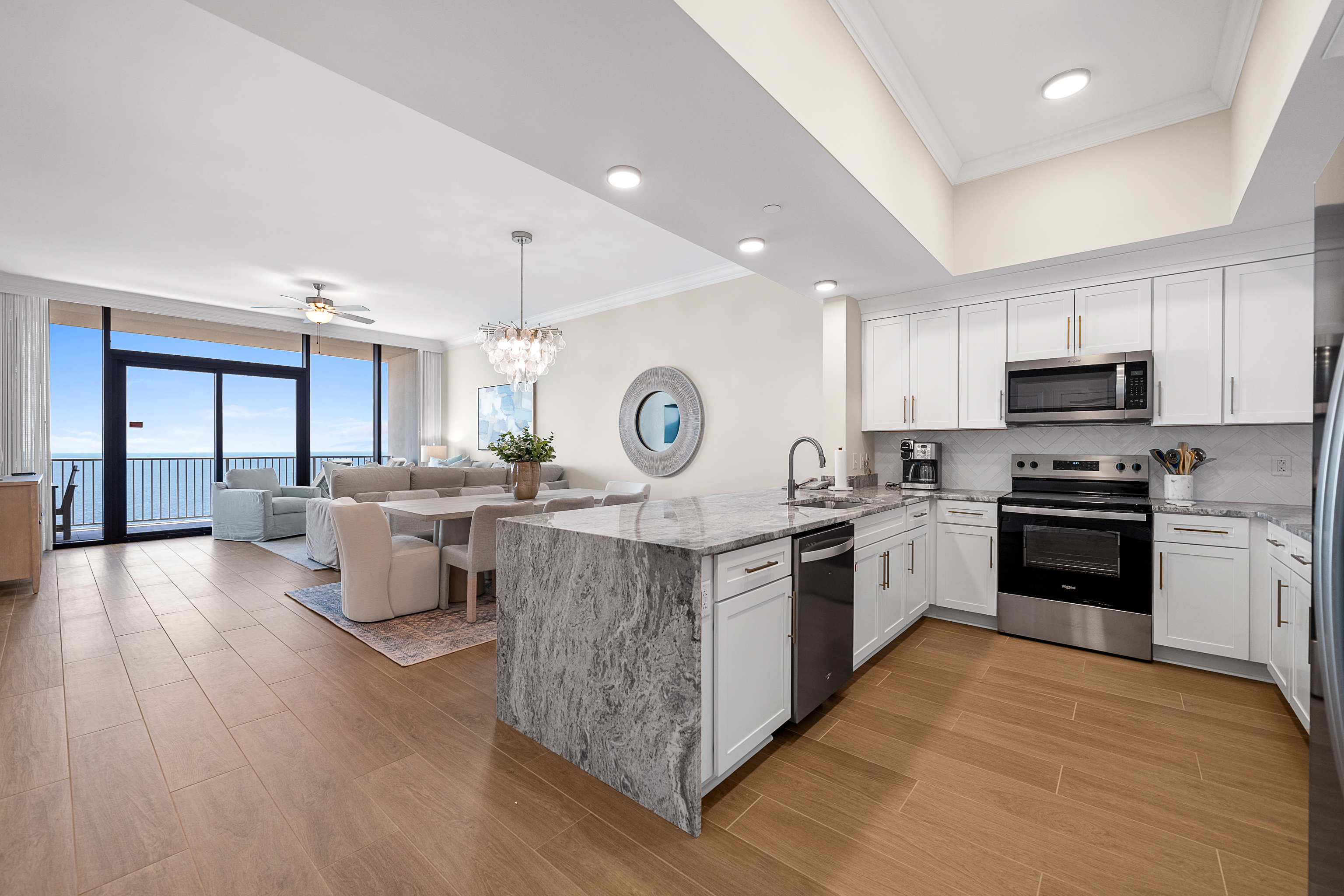 Featuring a stunning waterfall countertop island, open-concept living with floor-to-ceiling glass, and three spacious bedrooms including a custom bunk room. This penthouse blends comfort and design like no other. Step onto the private 25th-floor balcony to take in breathtaking sunsets over the endless Gulf horizon.